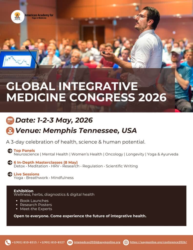A Conference of Biology and Clinical Applications of Yoga, Ayurveda & Integrative Therapies, Diagnostics and Rehabilitation The American Academy of Yoga and Medicine (AAYM) will host the world’s first American Conference on Yoga, Ayurveda & Integrative Therapies for Chronic Diseases & Public Health on May 2026, in Memphis, Tennessee, USA.