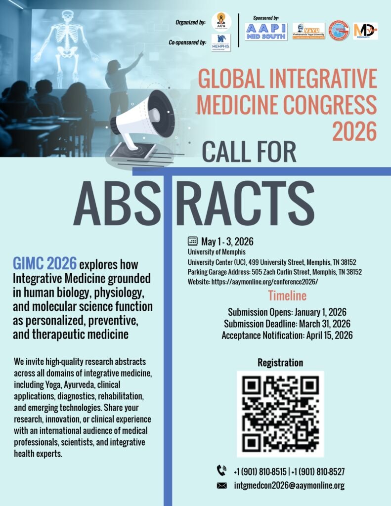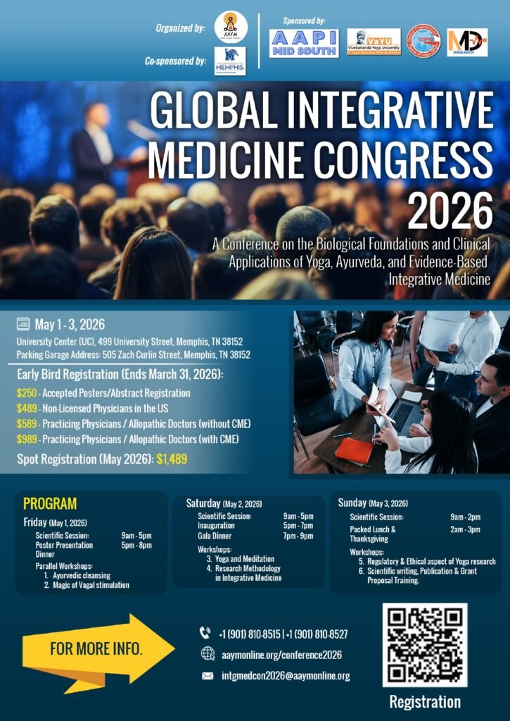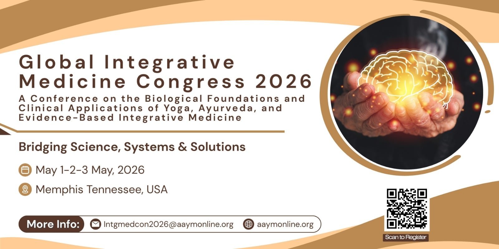 A Conference on the Biological Foundations and Clinical Applications of Yoga, Ayurveda, and Evidence-Based Integrative Medicine. The American Academy of Yoga and Medicine (AAYM) will host the world’s first American Conference on Yoga, Ayurveda & Integrative Therapies for Chronic Diseases & Public Health on May 2026, in Memphis, Tennessee, USA.